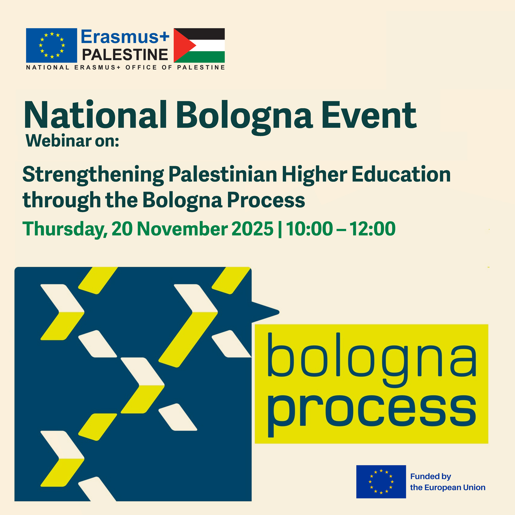 On behalf of the National Erasmus+ Office in Palestine, we invite you to join the webinar Strengthening Palestinian Higher Education through the Bologna Process on Thursday, 20 November 2025 (10:00–12:00).