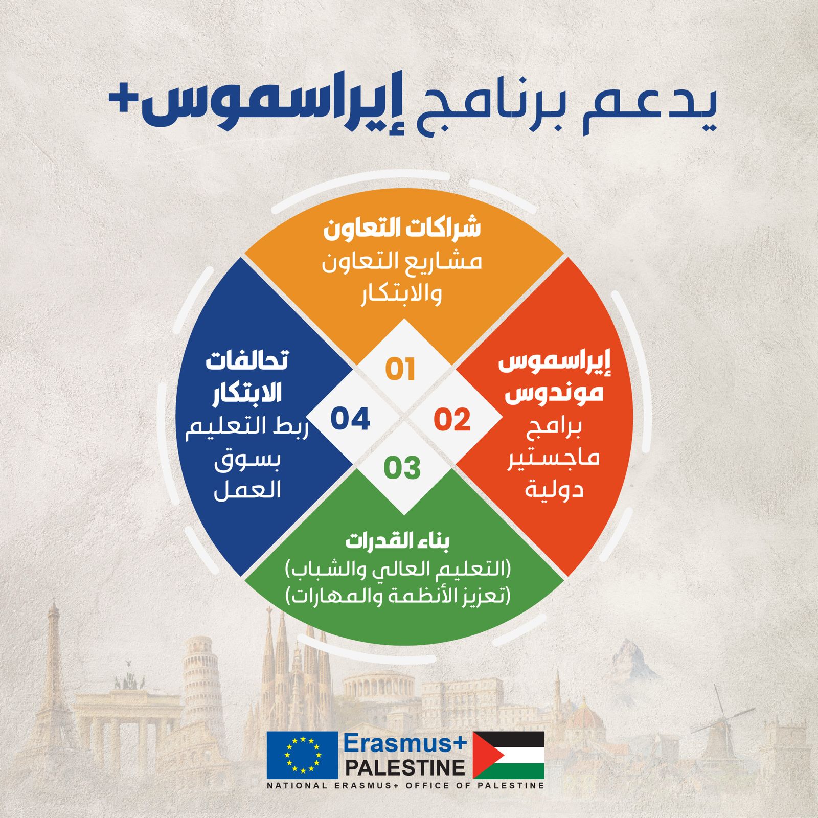 ماذا تدعم مشاريع إيراسموس+ في فلسطين؟ Share Written By Erasmus Palestine Tags 2026-04-18 ماذا تدعم مشاريع إيراسموس+ في فلسطين؟ تدعم مشاريع إيراسموس+ أنشطة حقيقية على أرض الواقع، من تطوير البرامج الأكاديمية وتقديم التدريب إلى تعزيز التعاون بين الجامعات. تسهم هذه المبادرات في بناء المهارات وتبادل المعرفة وتعزيز الابتكار What do Erasmus+ projects do in Palestine? Erasmus+ projects support real activities on the ground — from developing academic programmes and delivering training to strengthening cooperation between universities. These initiatives help build skills, share knowledge, and drive innovation.